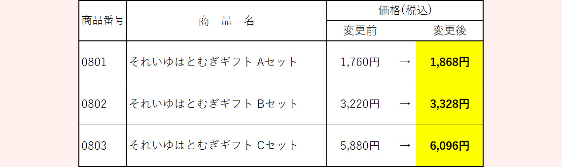 ※改定日以降、セット商品(それいゆはとむぎギフトセット)も改定後の価格と内容量に合わせた内容となります。ご了承ください。