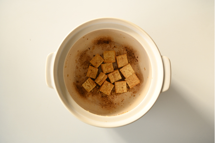 • ショウガとニンニクをみじん切りにし、鍋にごま油を入れて炒める。香りがしてきたら、湯通しした厚揚げを入れて炒める。